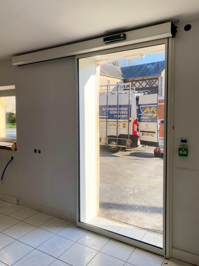 L'équipe AFC vient de réaliser l'installation d'une porte automatique coulissante à un vantail dans le Calvados. Ce projet a aussi nécessité l'habillage complet du tableau de maçonnerie en tôle aluminium laquée.