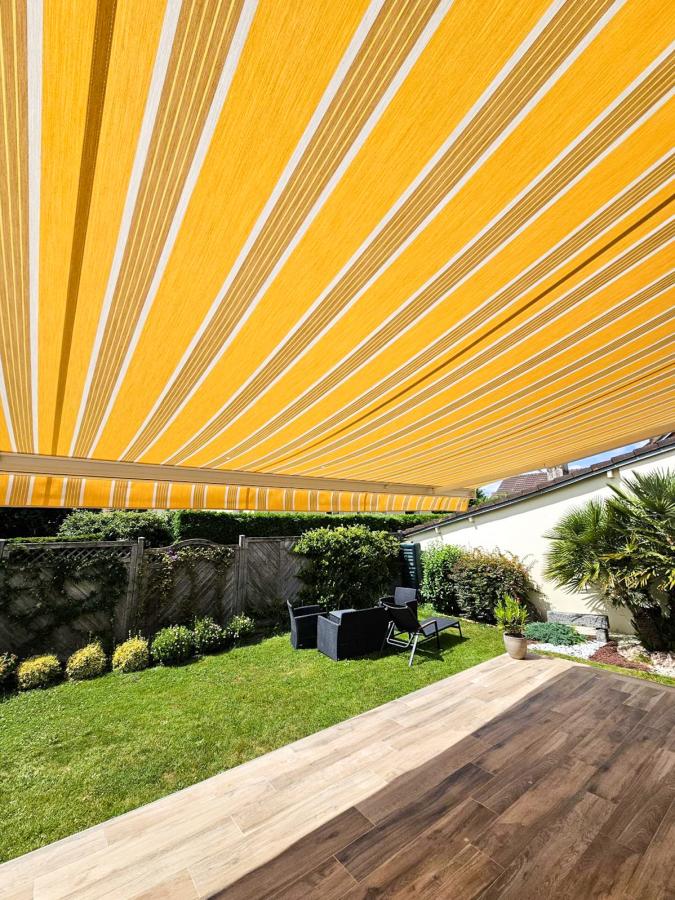 Le choix du coloris jaune rayé apporte du caractère à la façade tout en créant une atmosphère chaleureuse sous le store déployé.